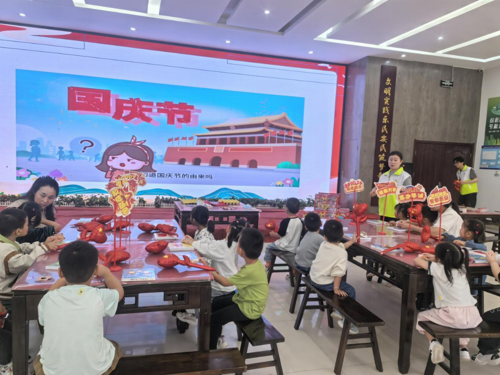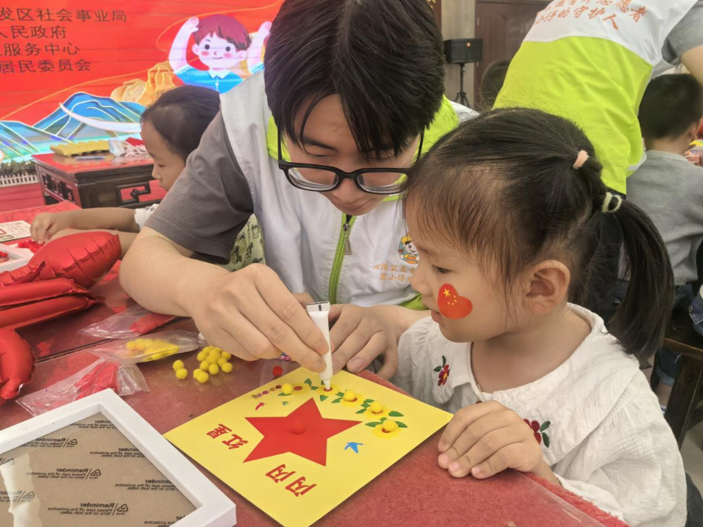 活动设置“知识宣讲、歌声传情、手工践悟”等多个环节,形式多样、寓教于乐。在“歌唱祖国”环节,孩子们手持小国旗,用稚嫩而真挚的歌声抒发对祖国的热爱;手工制作现场,志愿者与儿童一对一互动,协助他们完成带有爱国元素的手工作品,让孩子们在实践中感悟家国情怀,进一步激发爱国热情与民族自豪感。